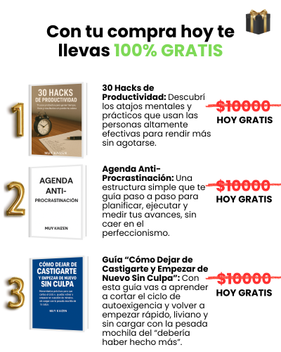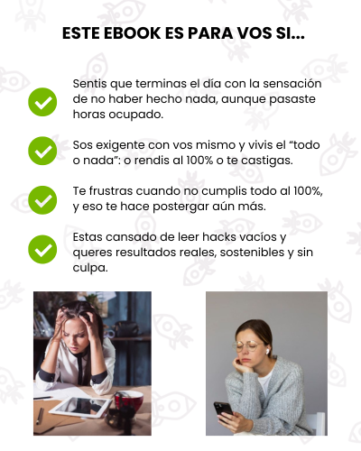 Incluye un plan probado de 21 días con ejercicios prácticos, reflexiones guiadas y estrategias paso a paso para romper los ciclos de postergación, recuperar tu enfoque y avanzar sin culpa ni autoexigencia extrema. Además, el ebook viene acompañado de 5 bonos exclusivos que multiplican tus resultados.